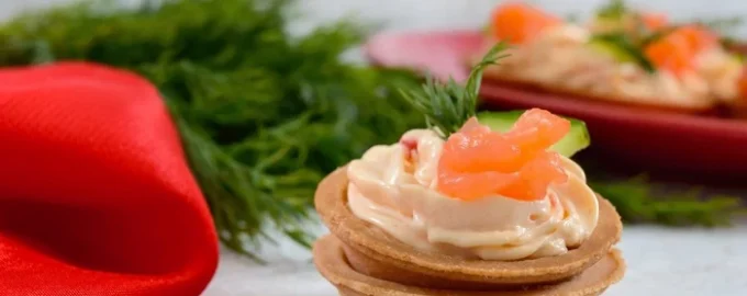 - Do misky dáme vajcia, uhorky, kôpor, soľ, pridáme tvaroh, premiešame, naplníme tartaletky a ozdobíme plátkami červenej ryby.